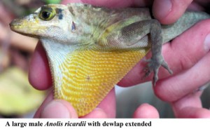 One interesting observation on A. richardii, is that there appear to be two morphs of males: one that is exceptionally large (120 mm) and often has white head markings and another that is smaller (about 70 mm) that appears to be mature with a well-developed yellow dewlap and hemipenal bulges in the tail. In early and mid-morning these lizards are sitting on vertical surfaces such as tree trunks, stream banks and road-cuts.