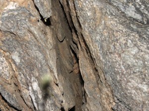 Ringtail1-3 10-5-2012: At this point it wouldn’t surprise me if people were starting to think, “Another damn ringtail report?” Yep, the novelty of one of the coolest nocturnal mammals that can’t eat me has yet to wear off. We hung out for 10-15 minutes before I headed off. During that time, as the first picture indicates where there’s a head peeking out of the space between boulders near my foot, the ringtail was even more comfortable to come near me. As I watched this lithe little mammal I couldn’t help but be impressed with how fluidly and effortlessly it moved over and through the rocks checking out cracks, investigating opening and poking around attendant to its duties as a ringtail. It even stopped moving (second image) and laid down a couple meters from me at the edge of the rock ridge where CT13 resides. The last image shows the ringtail next to CT13’s flag in front of the antenna. The next night the ringtail returned to keep myself and Jon Davis company and investigated the flag, nosing it and pulling at it with its teeth. CT13, again, wasn’t visible and hadn’t moved. The previous week CT13 had been on the E/SE slope of IMH, this week she was on the north slope at the east end of IMH.