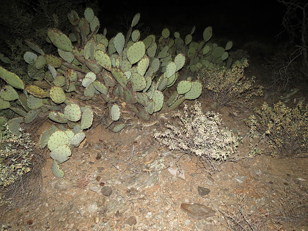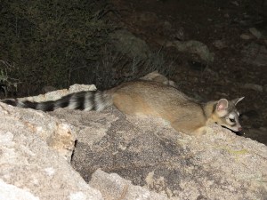 Arriving at the site Friday evening Roger and I were pleasantly surprised to find the site devoid of hunters and conditions beautiful for a night’s stroll tracking snakes amongst the saguaros. Enjoying another outstanding sunset while mass signaling from the top of IMH I split from Roger to head after CT13. Due to how close CT13 appeared from her signal strength and how easy she’d be to get Roger was even kind enough to offer to open the data sheet he gave me. What a guy!…but then the tracking took place. She wasn’t far, really, but she was in some of the rockier and more difficult terrain to traverse. No problem, and even though she wasn’t visible, I got to spend more time with my furry tracking buddy. The ringtail showed up as I was changing batteries in the GPS before continuing on my circuitous route that would bring me back to the same general area on IMH to track the last snake of the night, CT12. On to the images which combine both nights of tracking.