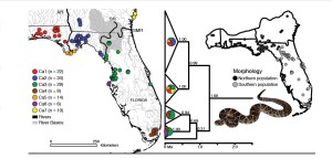 In an early on-line version of a new paper by Margres et al. (2015), the authors examine the feeding system of the Eastern Diamondback Rattlesnake. They combine venom, morphology (head shape and fang length) and ontogeny over the various environments and geography the snake inhabits. Using a genotype-phenotype map approach, protein expression data, and morphological data they found: ontogenetic effects explained more of the variation in toxin expression variation than geographic effects; both juveniles and adults vary geographically; variation in toxin expression was a result of directional selection; and different venom phenotypes co-varied with morphological traits also are associated with feeding in temporal (ontogenetic) and geographic (functional) contexts.